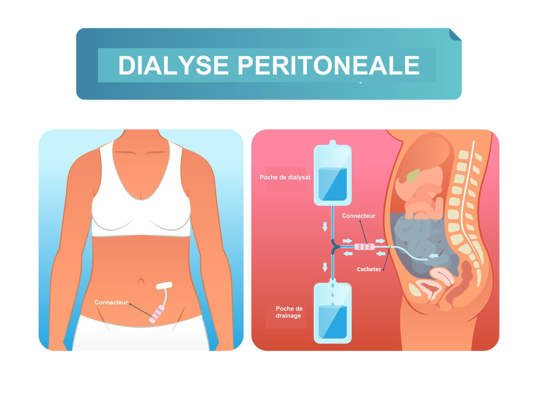 Dans ce cas, un liquide spécial est introduit dans la cavité abdominale via un cathéter. Ce liquide aide à éliminer les déchets et l'excès de liquide du sang à travers la paroi abdominale, en utilisant le péritoine (la membrane qui tapisse l'abdomen) comme filtre.